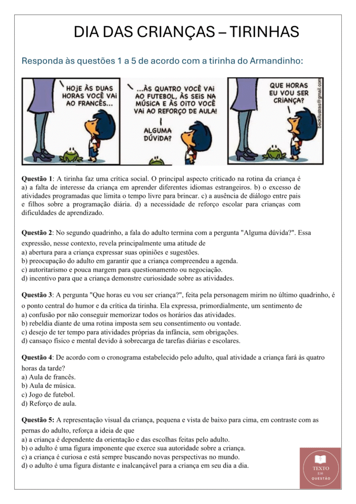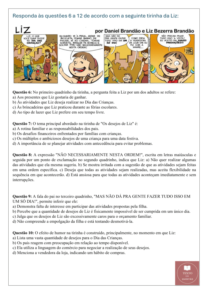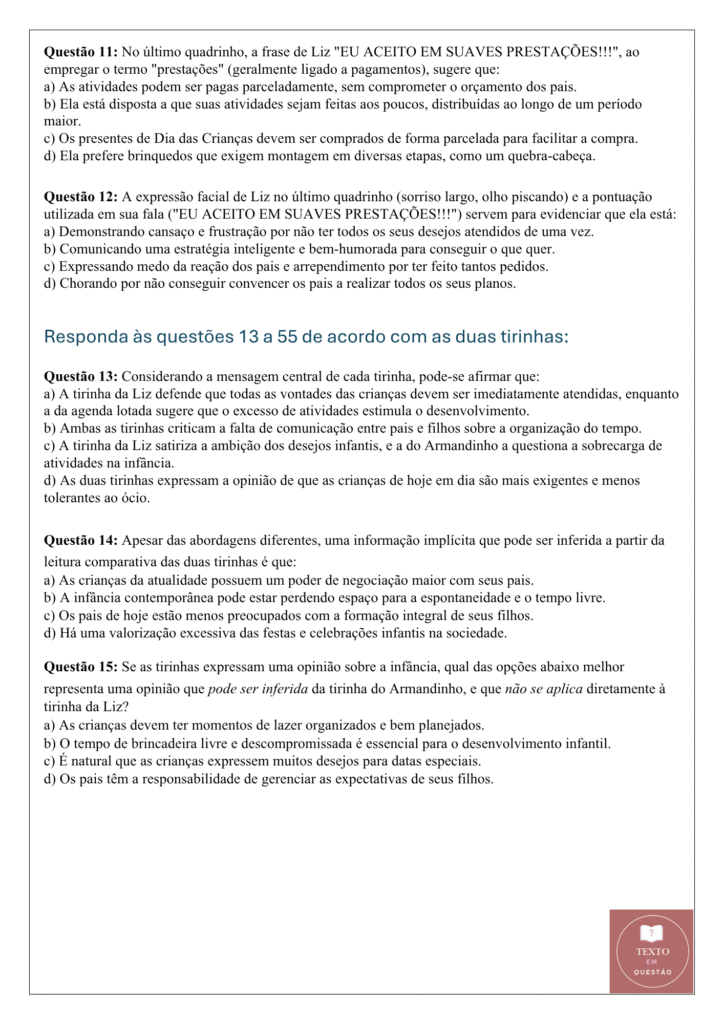 Olá, colegas professores! Quer otimizar seu trabalho e engajar seus alunos com uma atividade super relevante? No Texto em Questão, preparamos um material de interpretação de tirinhas focado no Dia das Crianças, com aquele formato que a gente já conhece do simulado SAEB!